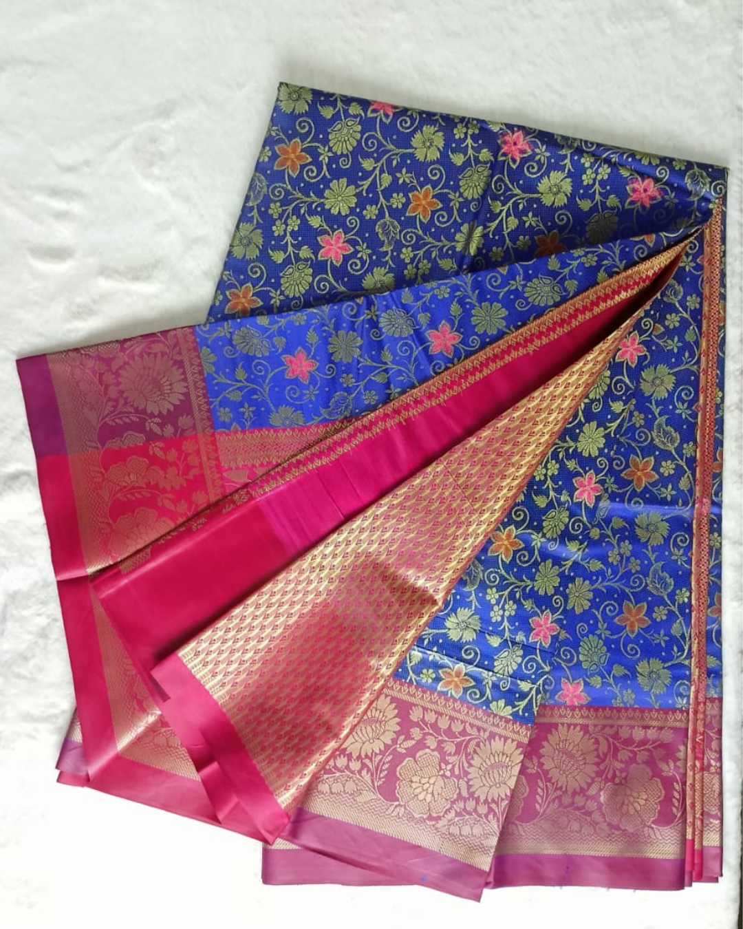 Lustrous texture, striking royal blue and magenta contrast, and intricate woven designs—ideal for weddings, grand festivals, or statement evening parties.